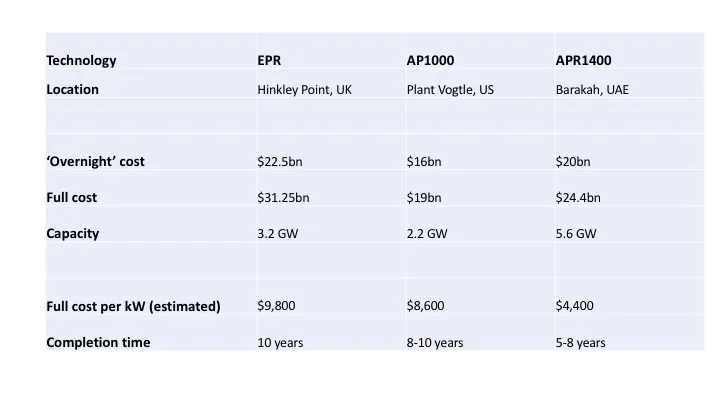 1) The Hinkley Point EPR is usually stated to have a projected ‘overnight’ cost of £18bn. I assume an exchange rate of £1 to $1.25. The full cost, including the interest burden during construction, is often written as £25bn, or about $31.25.