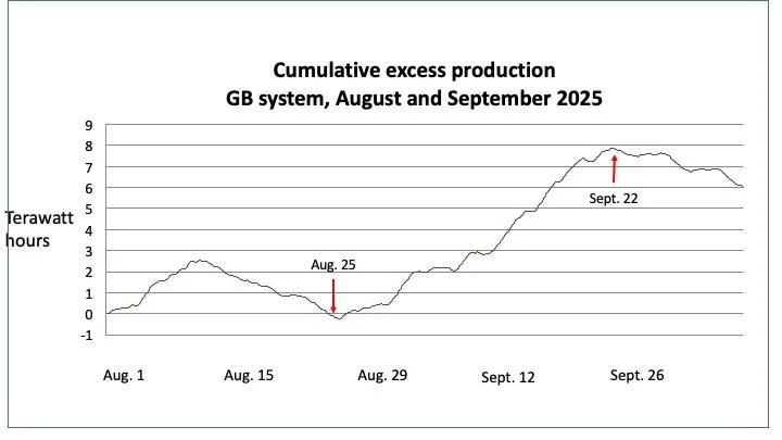 I looked at how much electricity would have been generated from 25th August to 22nd September 2025 if the target solar and wind capacity for 2030 was already in place. This period would have seen substantial and long periods of excess production. My purpose was to give a rough idea of how much storage capacity will be needed as the UK expands intermittent renewables.