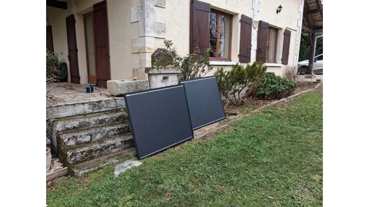 Lightweight slim solar panels, plugged into a house socket and waiting to be attached to the wall of our house.